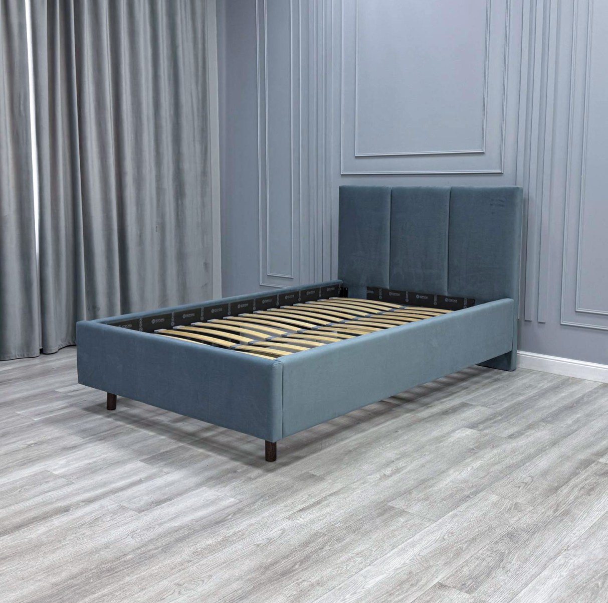 Односпальная кровать на высоких деревянных ножках в современном стиле выглядит гармонично и привлекательно. Благодаря компактным размерам она отлично подходит для комнаты подростка или молодежной спальни.